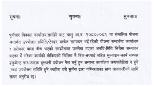 पूर्वाधार विकास कार्यलय, सर्लाही ActivitiesDownloadsNoticesRightSidebarSlider नागरिक वडापत्र November 22, 2024 Umesh Sah District Rate ListDownloadsNotices आ.व.२०८१/०८२ को जिल्ला दररेट सर्लाही August 27, 2024 Umesh Sah Notices पूर्वाधार विकास कार्यालय सर्लाहीको एक अत्यन्त जरुरी सुचना!!! June 27, 2024 Umesh Sah Notices आशयपत्र सम्बन्धि सुचना June 3, 2024 Umesh Sah दिगो र भरपर्दों पूर्वधार; विकास र समृद्धिको आधार सूचना परियोजना डाउनलोड ग्यालरी प्रगति विवरण